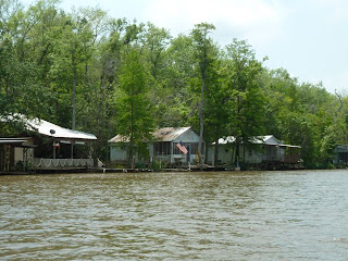 | Weekenders sit along the river . This one called "Sugar Shack". There are quite a few along the river and bayous. They can only be reached by boat. |